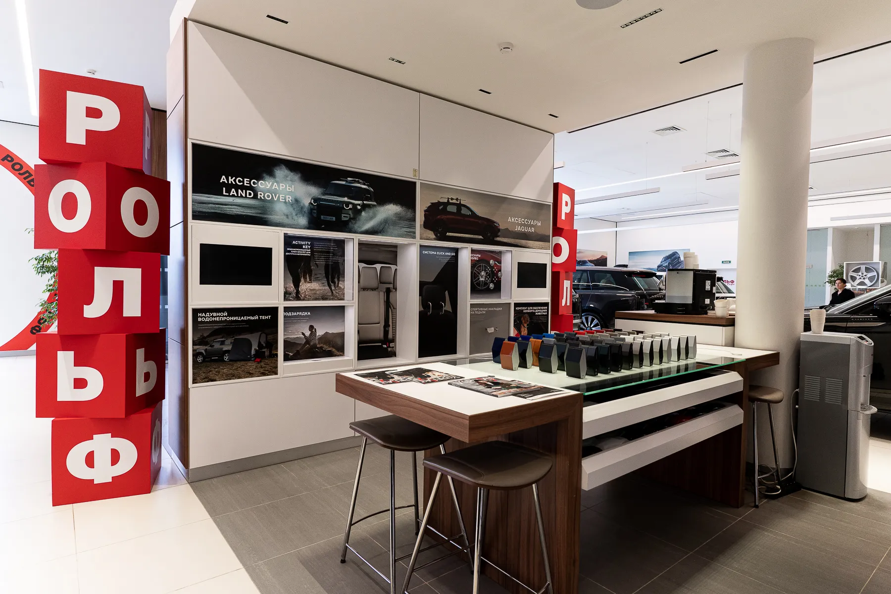 В просторном демонстрационном зале дилерского центра представлена вся линейка новых автомобилей модельного ряда Jaguar доступных для тест-драйва.